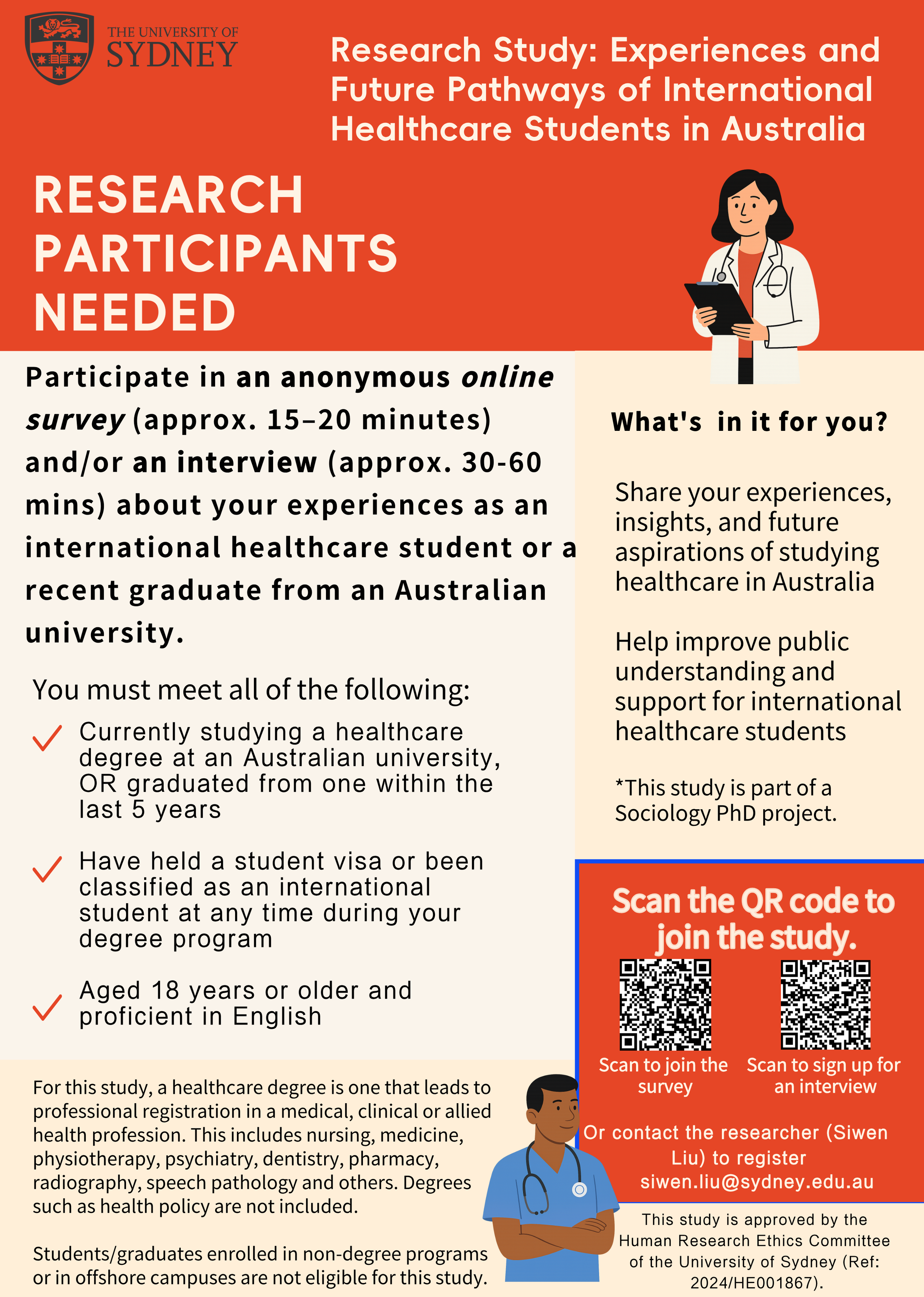 Recruitment has now started for our study of international healthcare students and recent graduates. There are two ways to participate: through an anonymous online survey and/or through an interview with PhD researcher, Siwen Liu.